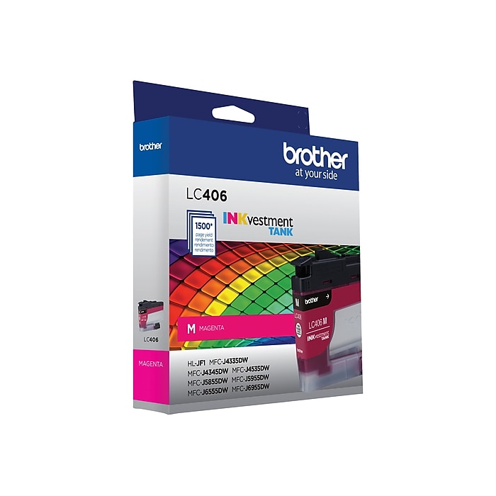 Brother Genuine LC406M Standard Yield Magenta INKvestment Tank Ink Cartridges deliver consistent, professional results and ultra convenience with an up to 1,500-page yield.* The INKvestment Tank printer’s internal tank works with the reengineered INKvestment Tank ink cartridges to eliminate manual refilling. INKvestment Tank ink cartridges continually supply ink to the internal tank so you get more pages without needing to refill. Brother Genuine INKvestment Tank cartridges are front-loading, plug-ins that are easy-to-use and hold more ink than traditional cartridges to minimize refills. Just take out the empty cartridge, plug-in a replacement and get back to printing with no waiting and no mess. Brother INKvestment Tank printers deliver truly uninterrupted printing, exceptional features, super convenience, large page yields and low-cost printing. Brother INKvestment Tank models include a 2-year limited warranty with free online, live chat or phone support for the life of the printer.