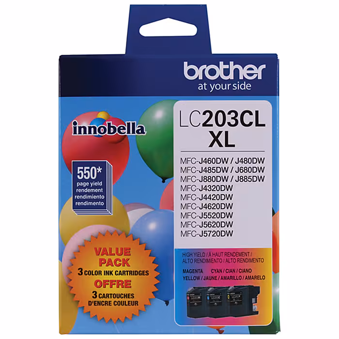 Produce vivid color prints with this 3-pack of Brother LC203 cyan, magenta and yellow high-yield ink cartridges.