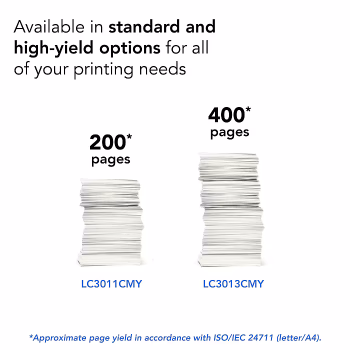 Brother Genuine LC3011M Standard-yield Magenta Ink Cartridges deliver consistent print quality with a 200-page yield* and work seamlessly with your Brother inkjet printer to produce rich, vivid color prints that last. For environmentally responsible cartridge disposal information visit www.brother-usa.com/environment. Use Brother Genuine LC3011M with Brother Work Smart Series all-in-one printers: MFC-J491DW, MFC-J497DW, MFC-J690DW, MFC-J895DW