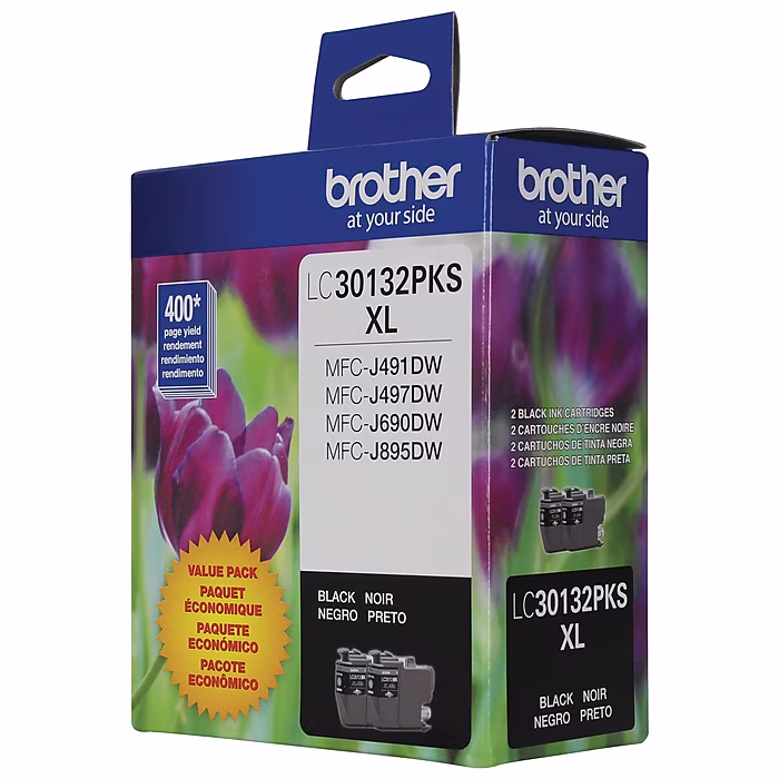Brother Genuine LC30132PKS 2-Pack High-yield Black Ink Cartridges deliver consistent print quality with a 400-page yield per cartridge* and work seamlessly with your Brother inkjet printer to produce sharp prints that last over time. For environmentally responsible cartridge disposal information visit www.brother-usa.com/environment. Use Brother Genuine LC30132PKS with Brother Work Smart Series all-in-one printers: MFC-J491DW, MFC-J497DW, MFC-J690DW, MFC-J895DW.