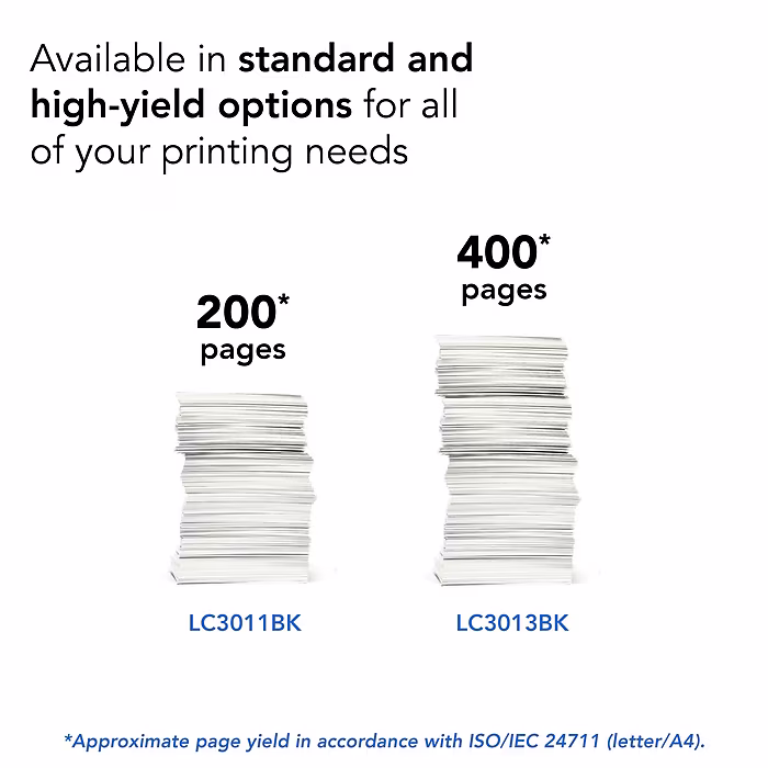 Using Brother Genuine LC3013BKS ink and toner help ensure reliable operation and protection of your Brother printer while delivering consistent, high-quality output.