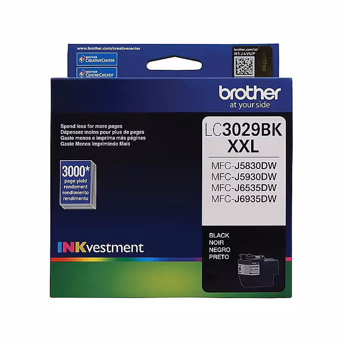 Enjoy a high-quality printing experience with this super-high-yield black ink cartridge. With a yield of up to 3,000 pages*, this cartridge is a strong choice for busy offices and other businesses with frequent printing tasks. This Brother INKvestment LC3029BK ink cartridge has vivid black ink to give text and images bold contrast against white paper, and it's sold individually, so you can purchase the exact quantity needed.