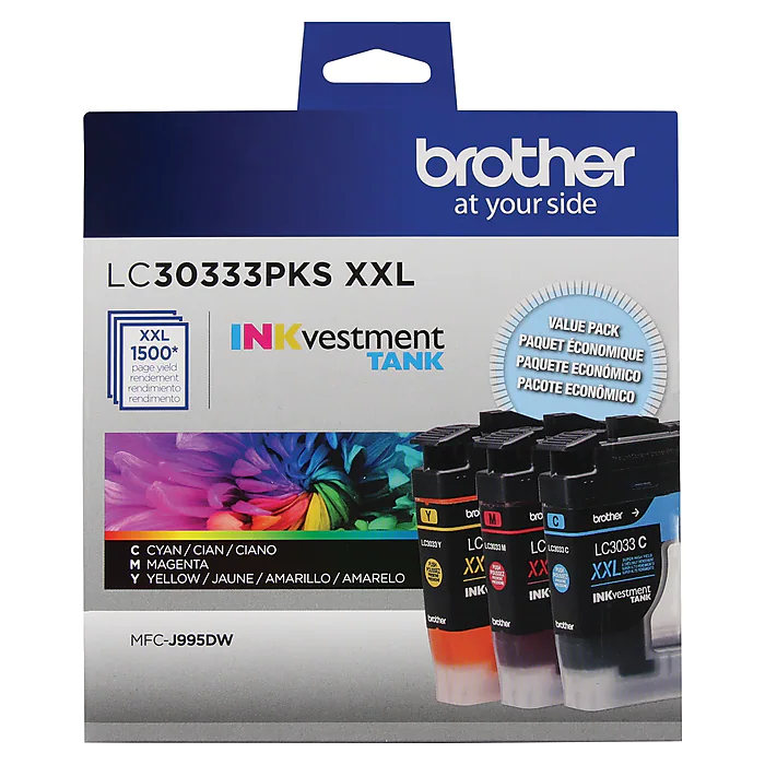 - Brother Genuine LC30333PKS 3-Pack Super High-yield Color INKvestment Tank Ink Cartridges; includes 1 each of Cyan, Magenta and Yellow.