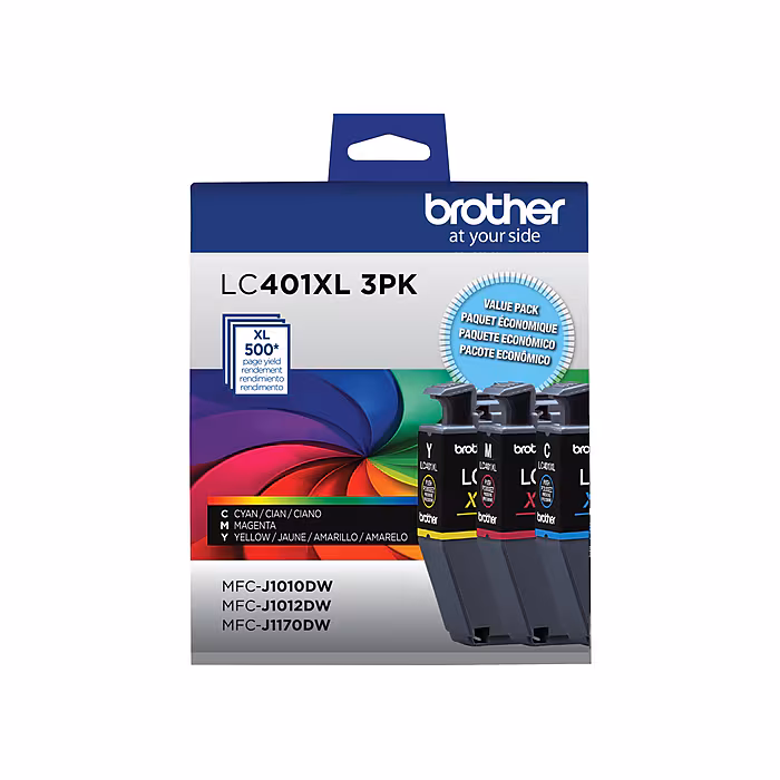 Always trust Brother genuine ink for superior inkjet print quality and performance you can consistently rely on. The Brother Value Pack includes one cartridge each of cyan, magenta, and yellow ink that deliver consistent, professional results and a high yield of up to 500 pages per cartridge (in accordance with ISO/IEC 24711). The Value Pack provides the ultimate convenience, giving you a full assortment of color ink cartridges in one package. All Brother genuine ink cartridges are intelligently engineered to work seamlessly with your Brother inkjet printer for consistent, reliable results. Brother genuine LC401XL3PK cartridges are for use with the following Brother all-in-one color inkjet printers: MFC-J1010DW, MFC-J1012DW, and MFC-J1170DW.