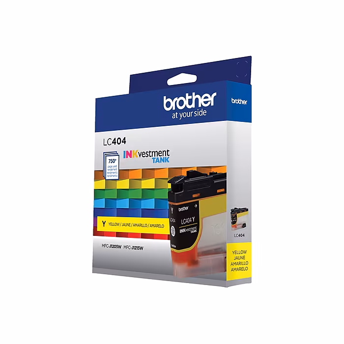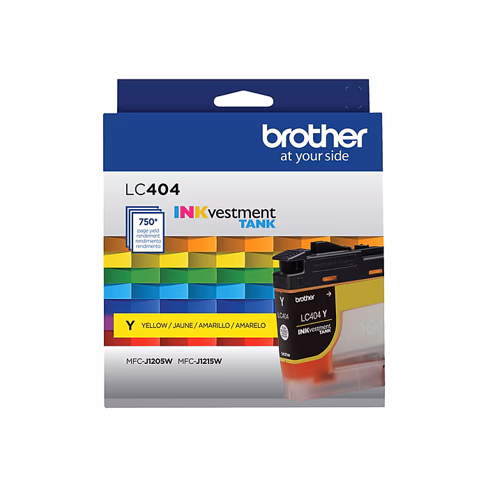 Trust Brother genuine ink for superior inkjet print quality, page yields, and performance you can consistently rely on. The Brother genuine LC404 yellow INKvestment Tank ink cartridge delivers consistent, professional print quality, and ultra convenience you can count on for up to 750 pages*. Brother Genuine INKvestment Tank ink cartridge offers the ultimate in convenience. The easy-to-use, front-loading plug-in INKvestment Tank ink cartridge holds more ink than traditional cartridges to continually supply ink to the internal tank, so you get more pages without needing to refill. When refilling is needed, simply take out the empty cartridge, plug in a replacement, and get back to printing with no waiting and no mess.