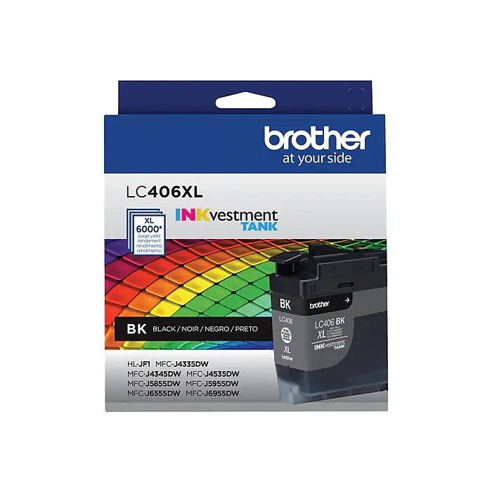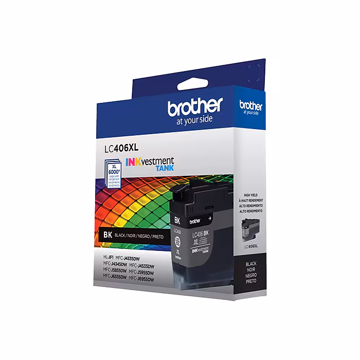 Always trust Brother Genuine ink for superior inkjet print quality and performance you can consistently rely on. Brother Genuine LC406XL BK High Yield Black INKvestment Tank Ink Cartridges deliver consistent, professional results and ultra convenience with an up to 6,000-page yield.¹ All Brother Genuine INKvestment Tank ink cartridges are intelligently engineered to work seamlessly with your Brother INKvestment Tank inkjet printer for consistent, reliable results. Brother Genuine LC406XLBK is for use with the following Brother INKvestment Tank all-in-one color printers: MFC-J4335DW, MFC-J4335DW XL, MFC-J4345DW XL, MFC-J4535DW and MFC-J4535DW XL.
