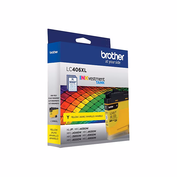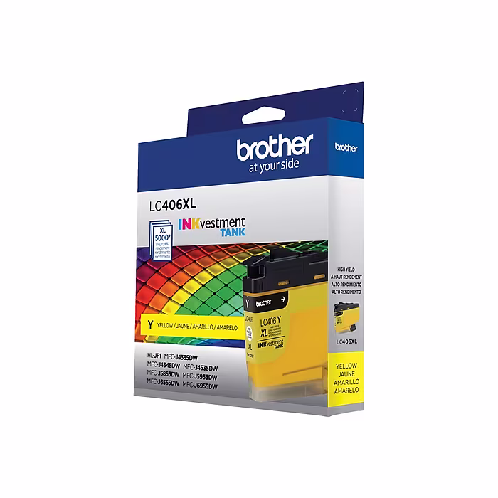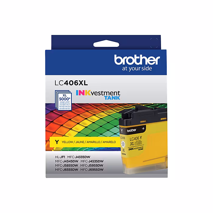 Always trust Brother Genuine ink for superior inkjet print quality and performance you can consistently rely on. Brother Genuine LC406XLY High Yield Yellow INKvestment Tank Ink Cartridges deliver consistent, professional results and ultra convenience with an up to 5,000-page yield.¹ All Brother Genuine INKvestment Tank ink cartridges are intelligently engineered to work seamlessly with your Brother INKvestment Tank inkjet printer for consistent, reliable results. Brother Genuine LC406XLY is for use with the following Brother INKvestment Tank all-in-one color printers: MFC-J4335DW, MFC-J4335DW XL, MFC-J4345DW XL, MFC-J4535DW and MFC-J4535DW XL.