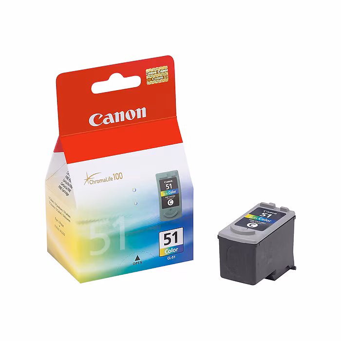 Get professional-quality text and images for important photos and documents with this Canon CL-51 tricolor high-yield ink cartridge.