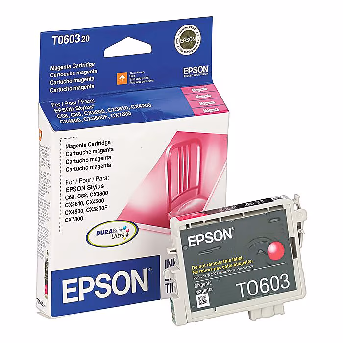 Enjoy quality photos and prints with this Epson 60 replacement magenta ink bottle.