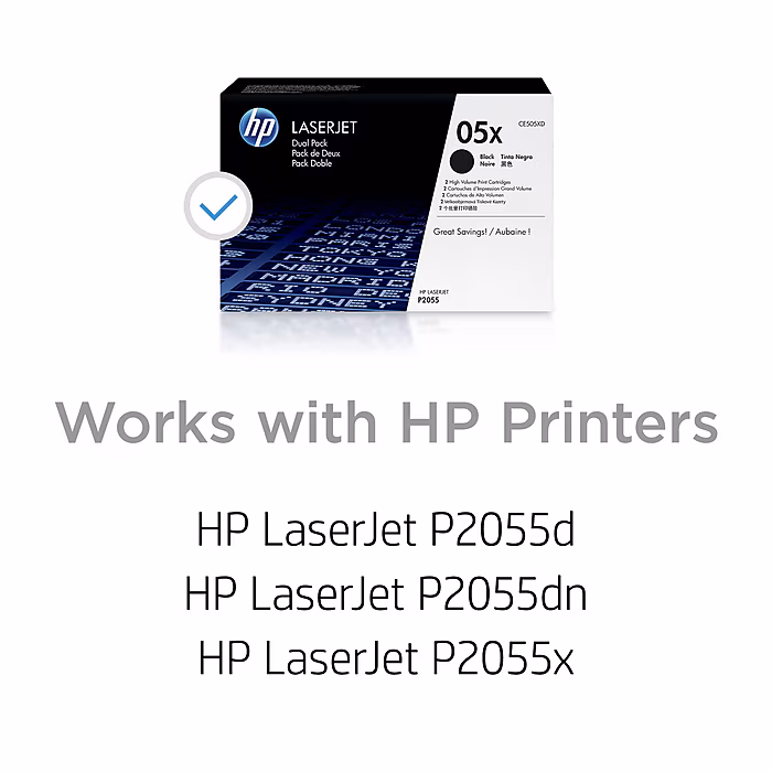 Put these HP 05X original LaserJet toner cartridges into your compatible HP printers. They're designed to work with HP LaserJet P2050, 2055, 2055d, 2055dn and 2055x models, so your office isn't limited to just one type of printer when you choose these laser cartridges.