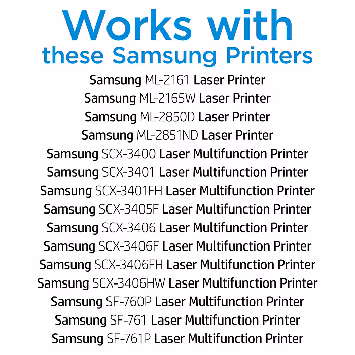 - Compatible with: Samsung ML-2160, ML-2161, ML-2162, ML-2162G, ML-2162W, ML-2163, ML-2163G, ML-2164G, ML-2164GW, ML-2164W, ML-2165, ML-2165W, ML-2168G, SCX-3400, SCX-3400F, SCX-3400FH, SCX-3401