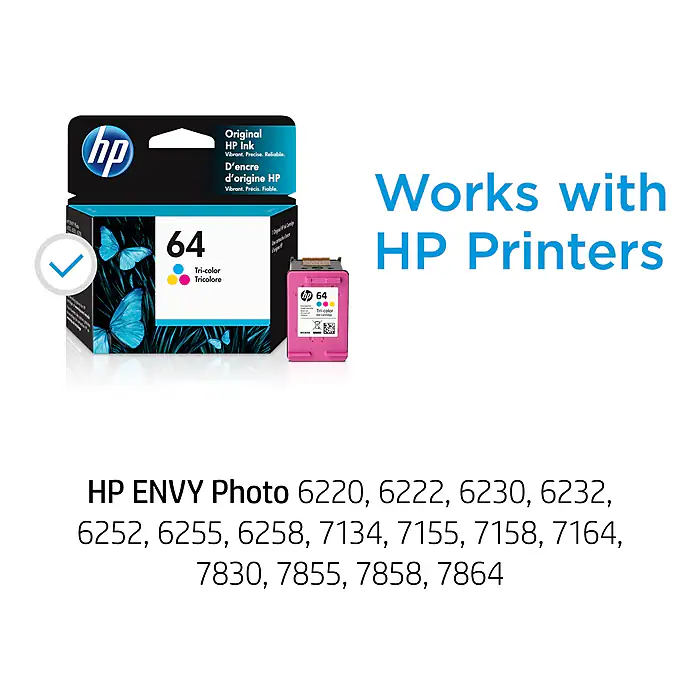 - HP 64 ink cartridges work with: HP ENVY Inspire 7955e, ENVY Photo 6220, 6222, 6230, 6232, 6234, 6252, 6255, 7120, 7130, 7134, 7155, 7164, 7820, 7822, 7830, 7855, 7858, 7864