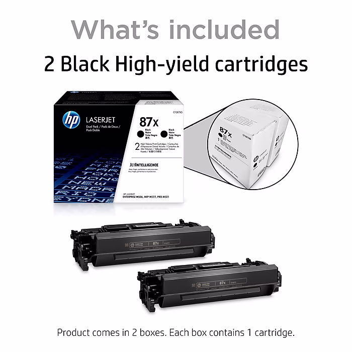 Tackle bulk printing projects with this 2-pack of HP 87X high-yield black toner cartridges.
